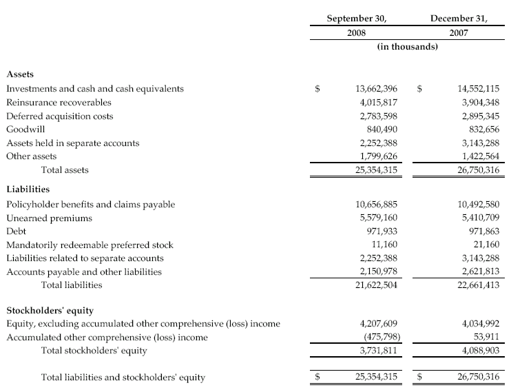 AOCI is composed of foreign currency translation adjustments, net unrealized gains/losses on securities, and pension underfunding. Net unrealized gains and losses represent the after-tax difference between the book value and market value of invested assets. At September 30, 2008, AOCI was ($475.8) million or ($4.03) per diluted share compared to $53.9 million, or $.45 per diluted share, at December 31, 2007. Invested assets at market value, excluding cash and equivalents, as a ratio of shareholders equity, including AOCI was 3.4 to 1 at September 30, 2008.